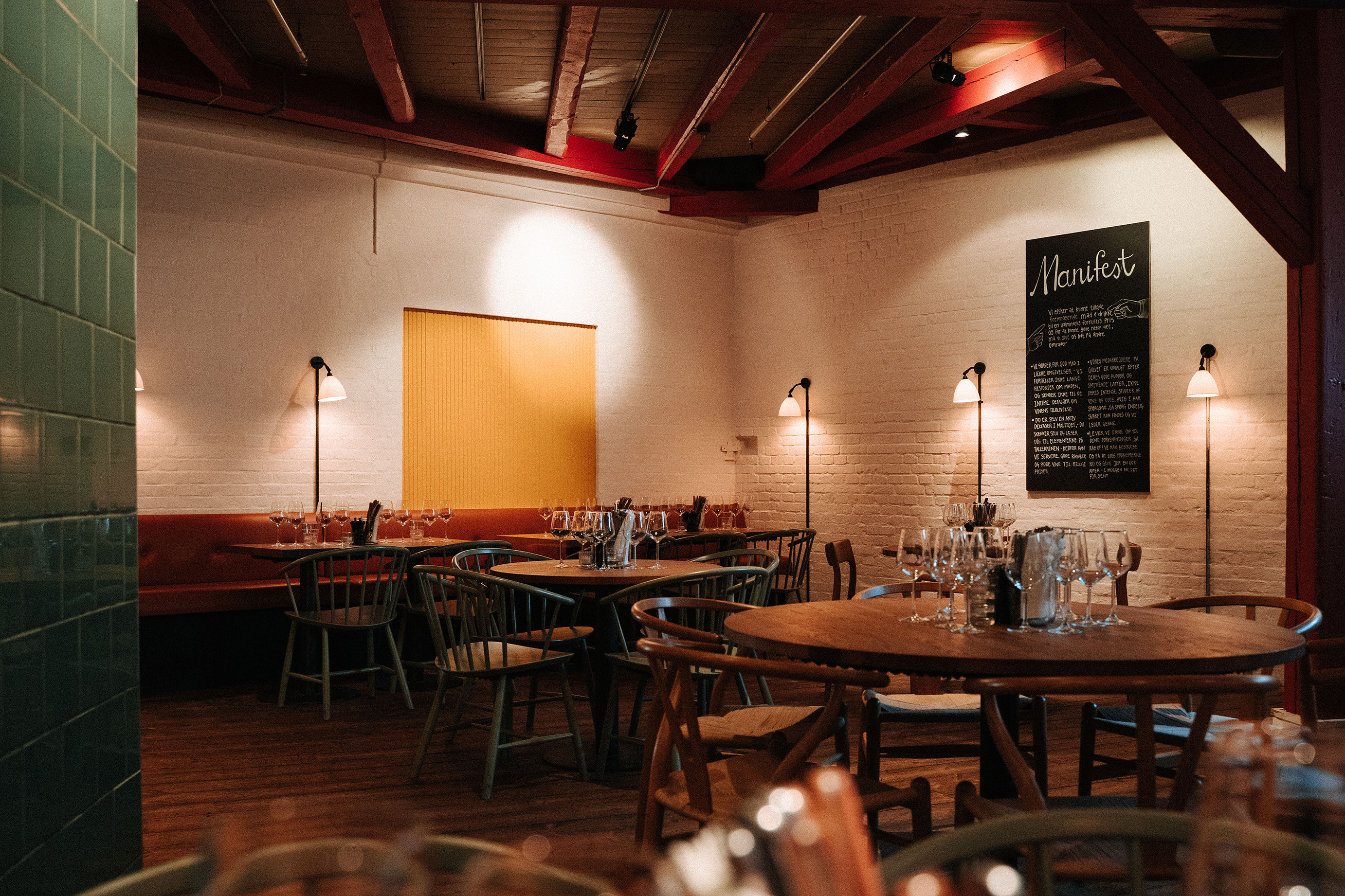 Restauranten har plads til næsten 200 mennesker og er indrettet med respekt for den historiske bygning. Den gamle elevator står stadig midt i lokalet - og rummer nu vores vinkøler. Samtidig er indretningen præget af møbler og interiør, der emmer af dansk og nordisk design.